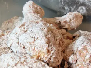 Once you remove your chicken from its egg fortified brine or buttermilk, shake off the excess and generously roll it in your seasoned flour. Set each piece aside to let the moisture of the brined chicken bond with the flour.