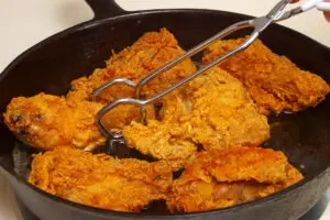 Traditionally, Southern fried chicken is pan-fried in a skillet, often a cast iron skillet, which helps to maintain a constant cooking temperature due to its thickness.