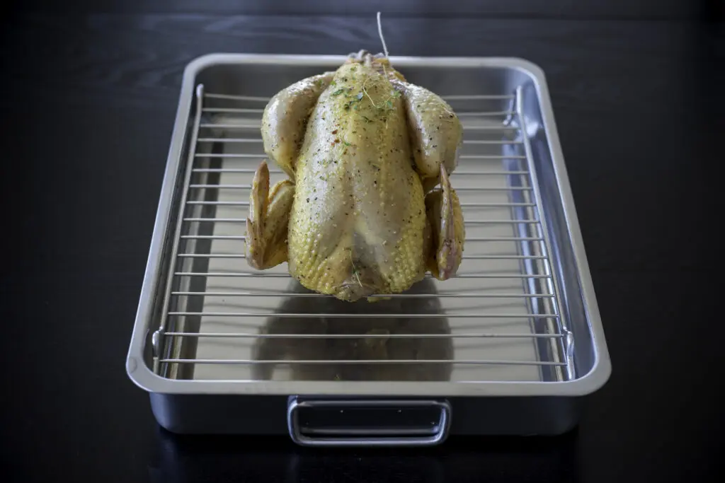 Have a roasting pan ready with a rack or grate, slightly above it, which allows you to roast your chicken with full hot air circulation, and not, with its undercarriage having to rest on the bottom of a solid metal surface. Partly roasting, partly simmering in juices.