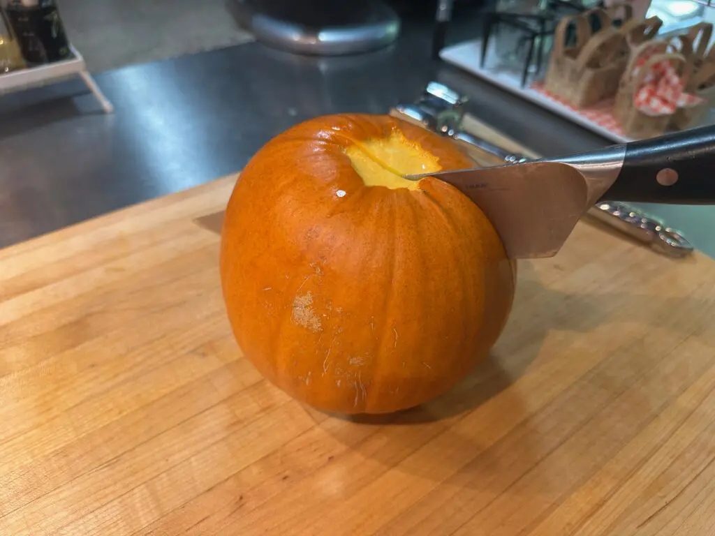 3. Cut the pumpkin directly in half, through the former stem area, from top to bottom.
