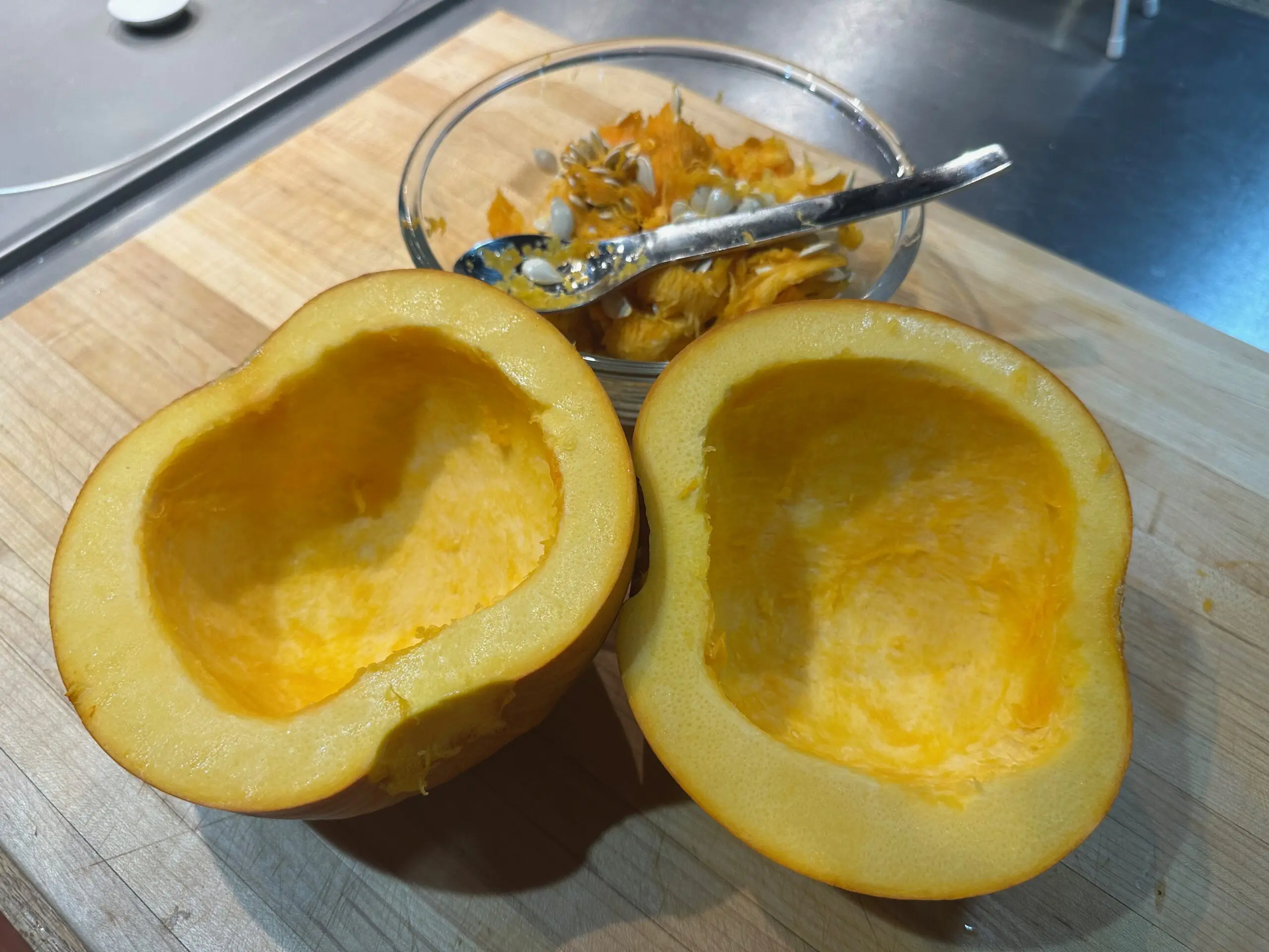 9. Once cooled, carefully remove the pulp from the inside of the pumpkin halves with a spoon.