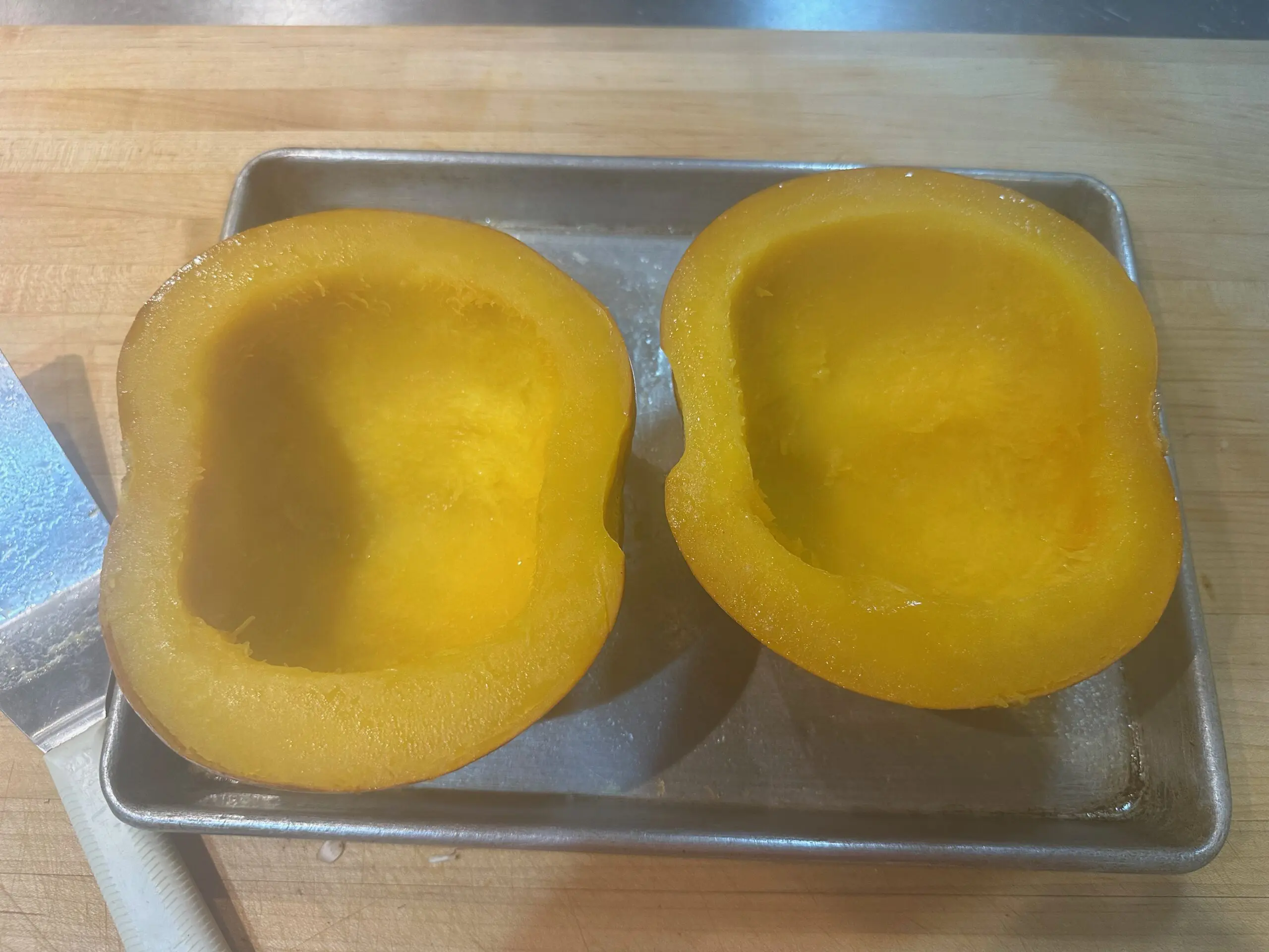 8. Remove the pan from the oven, turn the halves over to expose the cooked pulp and allow them to cool.